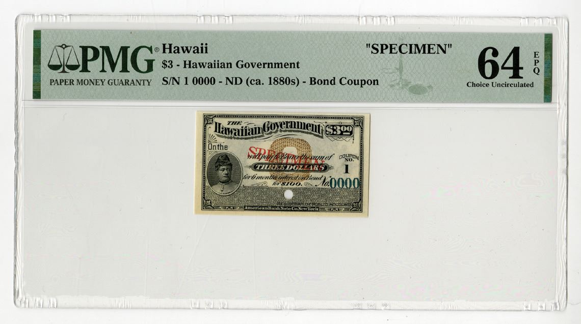 Hawaii, ND (ca.1880s). $3 Specimen Bond Coupon, Black on brown underprint and portrait of Queen left, Back is brown with large "1" at center, S/N 1 0000, Specimen overprint and POC, Rare Hawaiian fiscal document, PMG graded Choice Uncirculated 64 EPQ, ABNC.