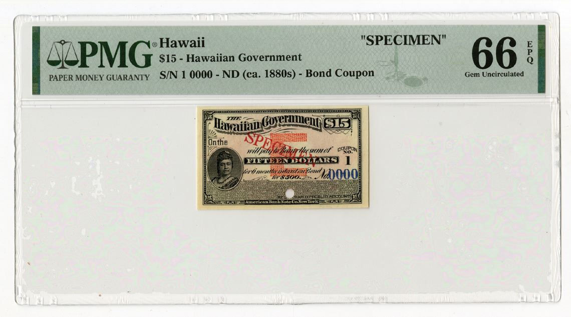 Hawaii, ND (ca.1880s). $15 Specimen Bond Coupon, Black on red underprint and portrait of Queen left, Back is red with large "1" at center, S/N 1 0000, Specimen overprint and POC, Rare Hawaiian fiscal document, PMG graded Choice Uncirculated 66 EPQ, ABNC.