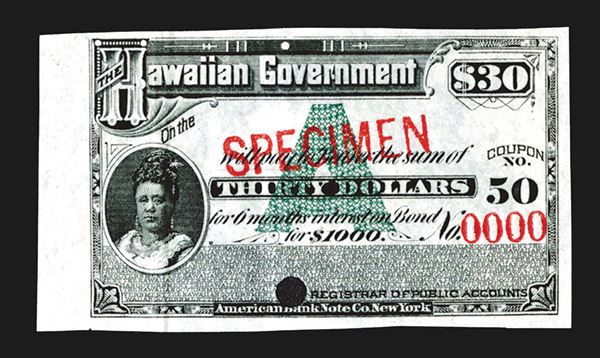 HI. Kingdom. Hawaiian Government Bond Coupon Specimen. $30 coupon. POC. Extremely Fine. ABNC