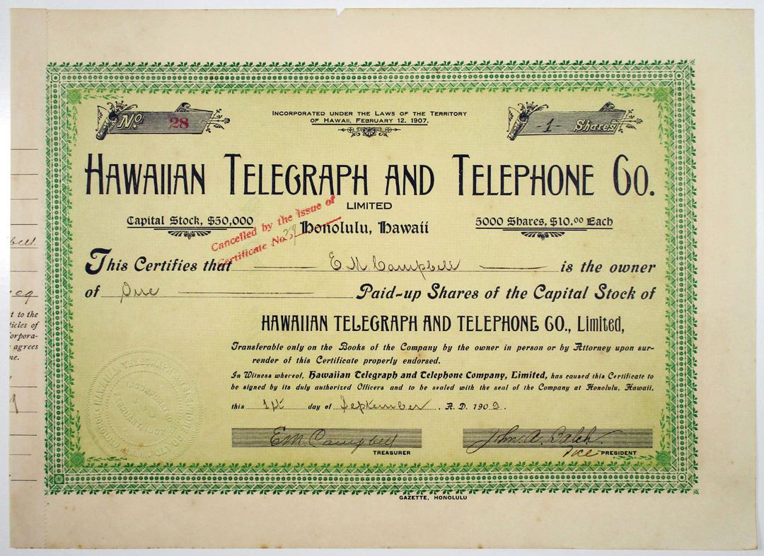 Honolulu, Hawaii, 1909. 1 Share I/C Capital Stock Certificate, S/N 28, Black text with green border and green-yellow background. Cancelled stamp at center. Fine-VF condition.