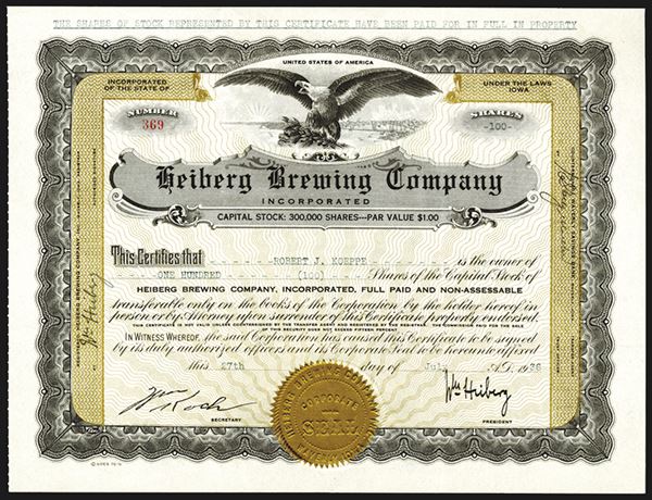IA. 100 Shares, I/U, Scarce brewery shortly after prohibition ended. VF.