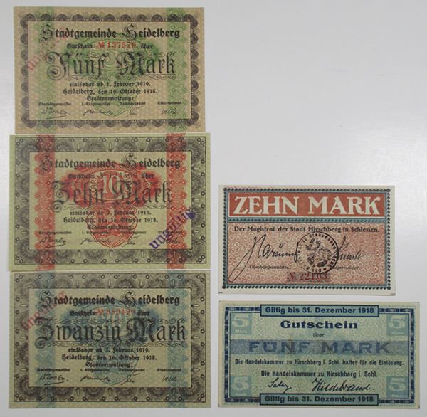 Germany. 1918. Lot includes from Hirschberg a pair of 5 and 10 Mark Notgeld, the 10 with a validation handstamp; and from Heidelberg a trio of 5, 10, and 20 Mark Notgeld, all voided with a "ungŸltig" handstamp. XF to AU. (5)