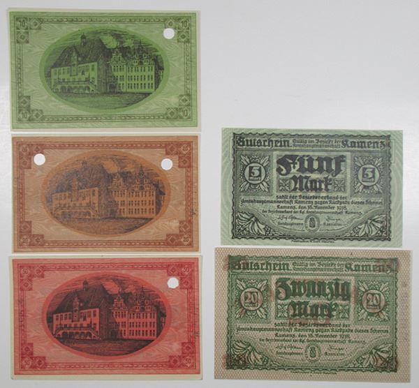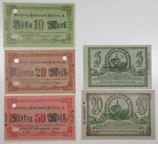 Germany. 1918, Lot includes from Heilbronn a trio of 10, 20, and 50 Mark Notgeld, all with POC; and from Kamenz a pair of 5 and 20 Mark Notgeld. XF to AU. (5)