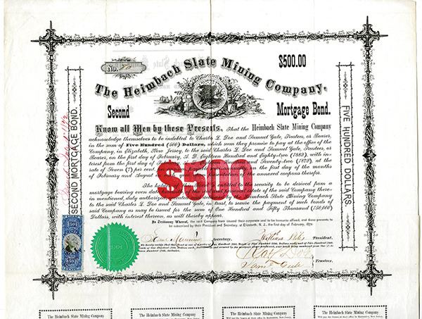 New Jersey, 1872. $500 I/U 7% Second Mortgage Coupon Bond #80, Black text with black border and red underprint, United States seal depicted at top center. Fine-VF condition.