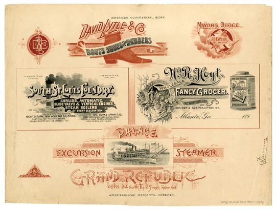U.S. and Germany, ND (1890s). U.S. designed and produced advertising cards, business cards, letter heads and bill heads offered by a German printing company, Joseph Heim, from Leipzig and Wien, as samples of American work. Evidently they represented the American companies in Europe as (American Mercantile Work), the card is 12 x 9.5 inches with card designs from St. Louis, Atlanta Georgia, and includes Fancy groceries, Steamboat excursions, foundry and others. 6 different card and letterhead designs are included on the sheet. VF condition and printed in dark red and black. All were printed by the Heinicke - Fiegel Lithographing Co., St. Louis.