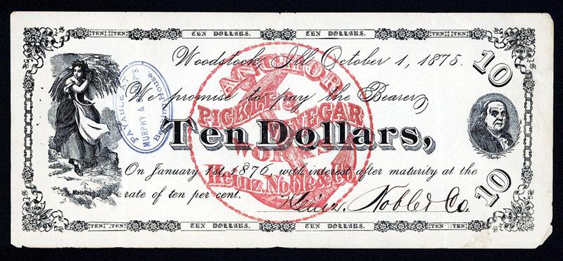 Heinz, Noble & Company - Anchor Pickle & Vinegar Works Obsolete Banknote, 1 of 3 Found.Woodstock, Illinois, October 1, 1875, $10, P-Unlisted, Issued obsolete banknote or scrip note. Allegorical female “Reaper” on left and Franklin on right with red circular underprint of company logo in red of Anchor with “Anchor Pickle & Vinegar Works - Heinz, Noble & Co”. Also black oval overprint on face “Payable at Murphy & Bishop Banking House”. a few small splits and the lower left and right corners either missing or detached but still present, a few small pin holes on the left margin, otherwise crisp, attractive and only 2 very light vertical folds. This was listed as a 3rd and final example offered by R.M.Smythe in 2004. Attractive and definitely rare well known and historic “Pickle” Company in high grade.