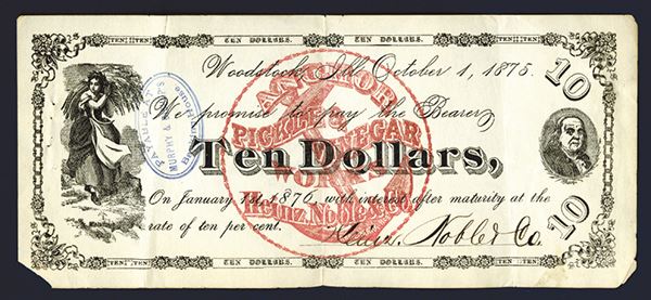 Woodstock, Illinois, October 1, 1875, $10, P-Unlisted, Issued obsolete banknote or scrip note. Allegorical female "Reaper" on left and Franklin on right with red circular underprint of company logo in red of Anchor with "Anchor Pickle & Vinegar Works - Heinz, Noble & Co". Also black oval overprint on face "Payable at Murphy & Bishop Banking House", a few small splits and the lower left and right corners either missing or detached but still present, a few small pin holes on the left margin, otherwise crisp, attractive and only 2 very light vertical folds. This was listed as a 3rd and final example offered by R.M.Smythe in 2004. Attractive and definitely rare well known and historic "Pickle" Company in high grade.