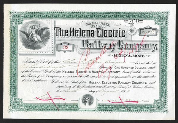 Montana, 1893. 208 and 55/100 Shares I/C Capital Stock Certificate #32, Black text with green border, Allegorical woman with large eagle at top left corner. Cancelled in red ink, VF condition, WBN.