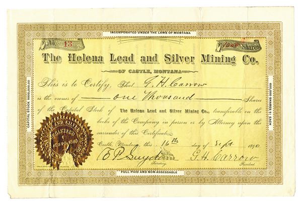 Montana. 1000 Shares Capital Stock Issued Certificate, Black print on brown border and yellow under tint, Company title at top, Fine condition with part of gold seal missing condition, Press of Journal Publishing Co..