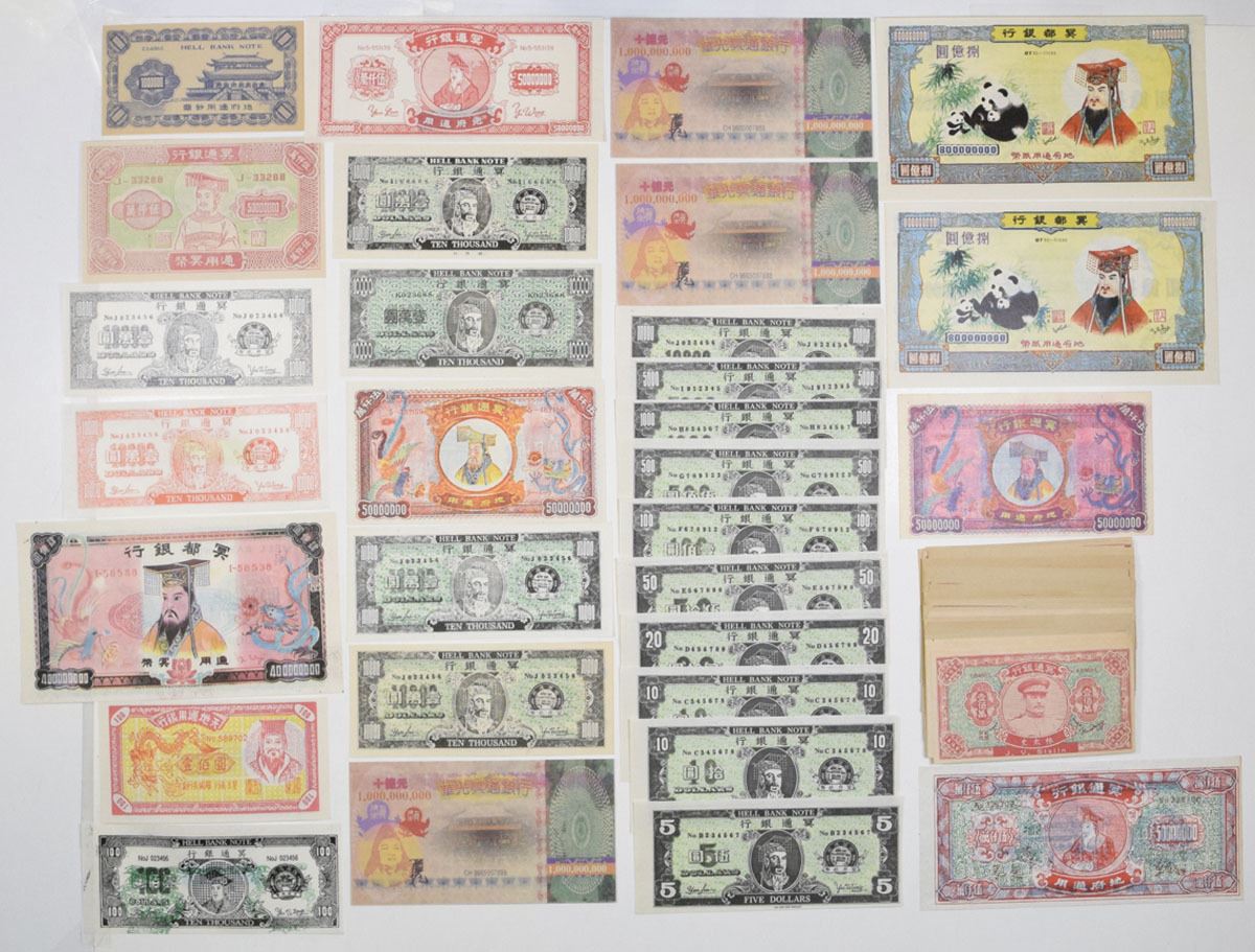 China, 1920s-1990s. Lot of 60+ ceremonial “Hell Bank Notes” used in traditional Chinese ancestor worship rituals. Included are multiple styles and denominations including "Stalin" the Russian dictator, with denominations ranging from $5 to #5,000,000,000 and beyond, issued by various fictional institutions such as the Bank of Heaven and Earth, Hell Bank, and the Underworld Bank. Designs depict emperors, deities, and mythological figures along with ornate borders, dragons, and symbolic imagery, printed in a range of vivid colors. VF to CU condition. (60+). Sold "AS IS" no returns accepted.