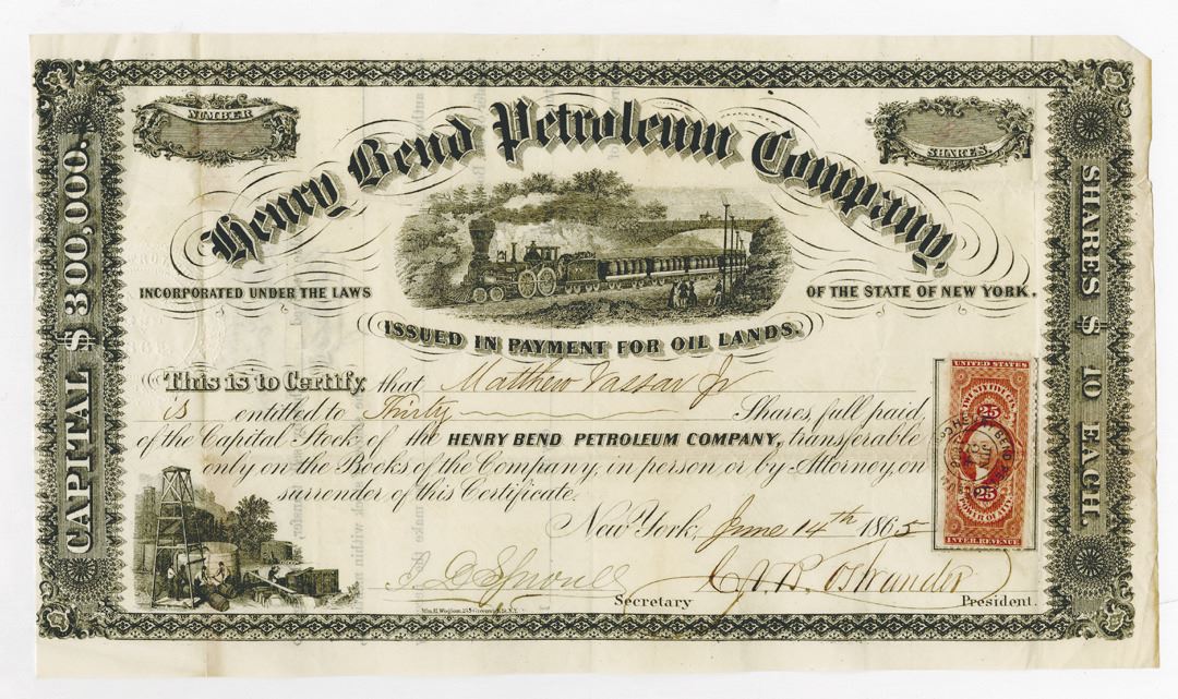 New York.... 30 Shares Capital Stock I/U Certificate, "Issued in Payment for Oil Lands", Black print on black border, Company title at top above locomotive with bridge in background and men loading oil barrels at bottom left corner, F-VF condition with minor damage to right side margin. Wm. H. Woglom.