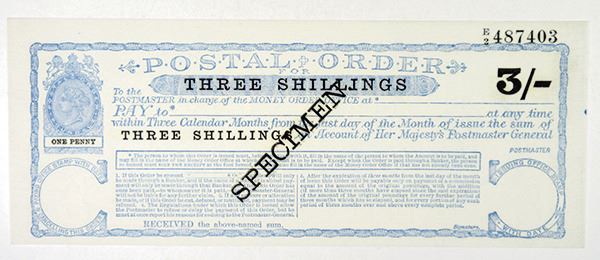 Great Britain, specimen postal order, 3/- Shilling, with black specimen overprint, blue on watermarked paper. A One Penny British Revenue Stamp printed on top left corner, black back, Scarce in this form. Uncirculated. Rare English Postal Order.