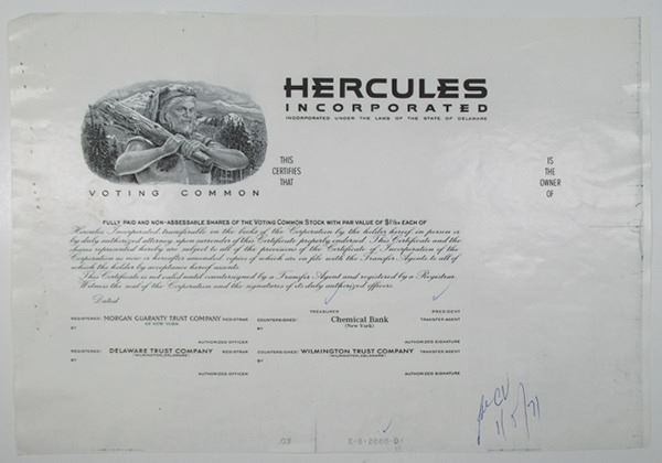 Delaware, 1971. Odd Shares Progress Proof Voting Stock Certificate, Black text on white paper, Hercules with wooden club at top left corner. VF condition with staple holes at left. Hercules, Inc., was a chemical and munitions manufacturing company based in Wilmington, Delaware, incorporated in 1912 as the Hercules Powder Company following the breakup of the Du Pont explosives monopoly by the U.S. Circuit Court in 1911. Hercules Powder Company became Hercules, Inc. in 1966, operating under this name until 2008, when it was merged into Ashland Inc. Hercules was one of the major producers of smokeless powder for warfare in the United States during the 20th century.