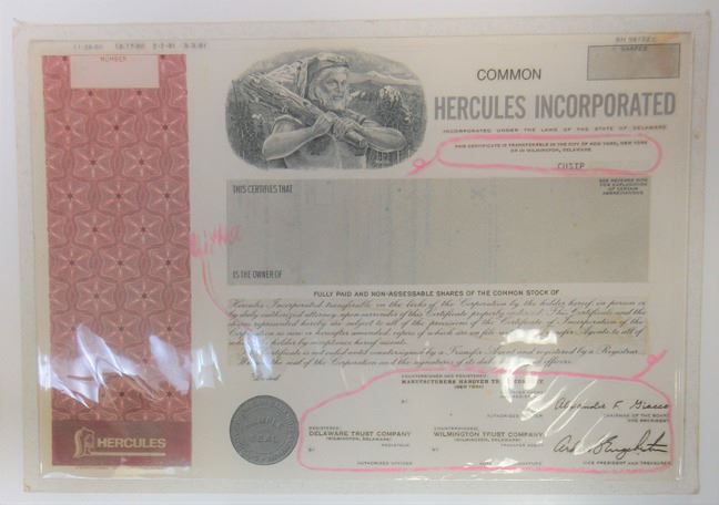 Delaware, 1981. The Mockup proof consists of different engraved and printed design elements which are pasted to a cardboard backing with different items added. Covered by plastic and in a folder to protect it. Unique in this format. This was the common method of designing stocks and bonds pre-computer. Hercules, Inc., was a chemical and munitions manufacturing company based in Wilmington, Delaware, incorporated in 1912 as the Hercules Powder Company following the breakup of the Du Pont explosives monopoly by the U.S. Circuit Court in 1911. Eventually Hercules Inc. became a part of Ashland Inc.
