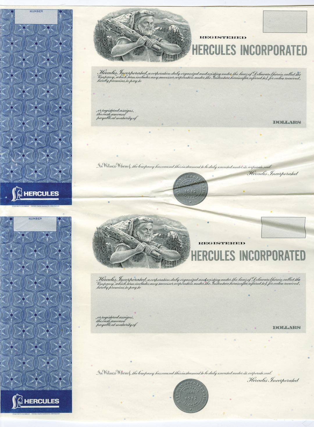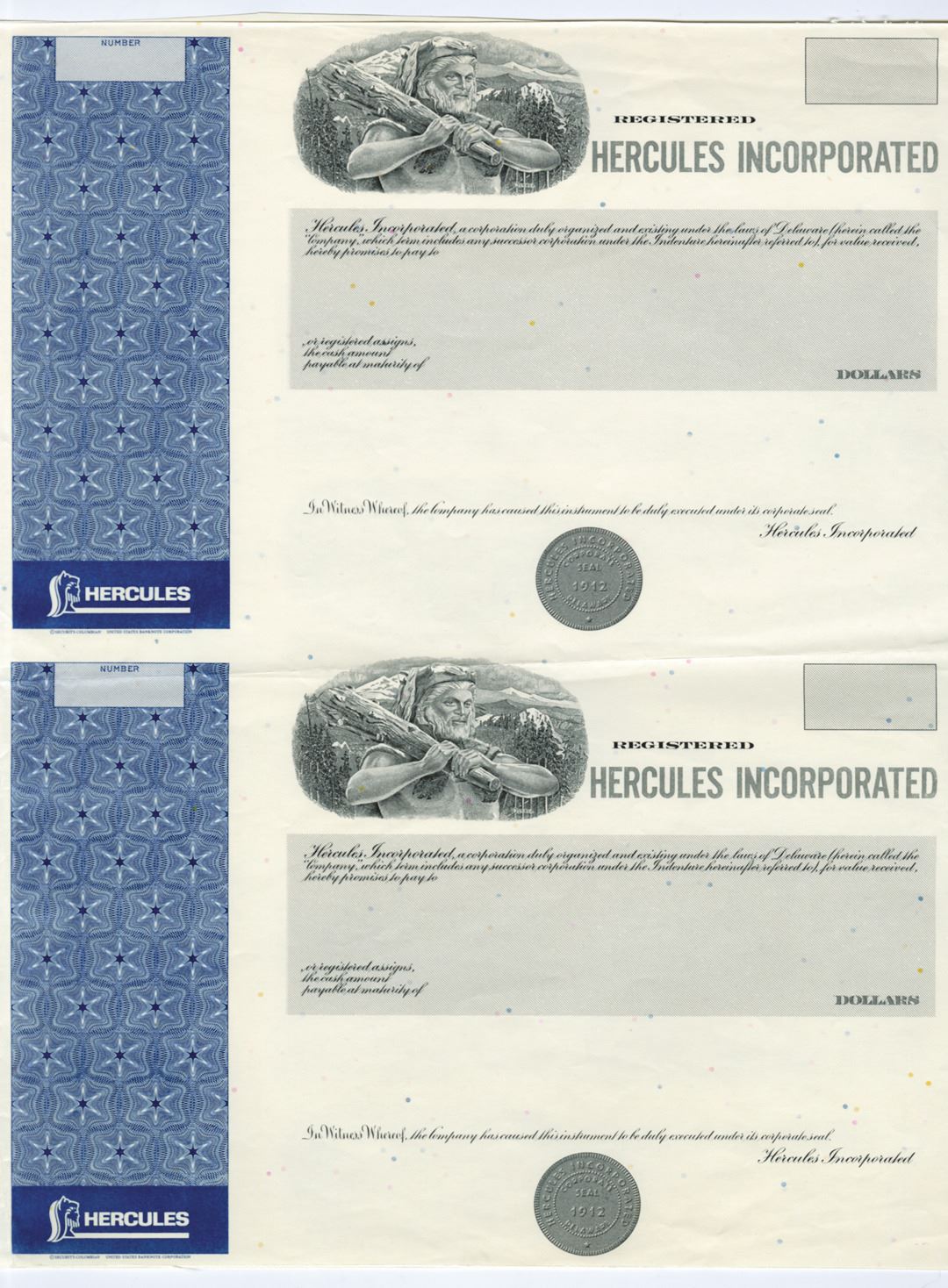 Delaware, Uncut sheet of 4 Proof Stock Certificates, All are Registered Bonds, Black printing with blue counterfoil on left, Hercules holding club top middle left, All are in XF to AU condition with archival folds from storage. Printed uniface on planchetted security paper, SC-USBNC. In 1902, DuPont purchased several smaller chemical companies, and in 1912 these actions gave rise to government scrutiny under the Sherman Antitrust Act. The courts declared that the company's dominance of the explosives business constituted a monopoly and ordered divestment. The court ruling resulted in the creation of the Hercules Powder Company (now Hercules Inc.) and the Atlas Powder Company (now AstraZeneca). Rare and historic DuPont related explosive companies. (Uncut sheet of 4 stocks).