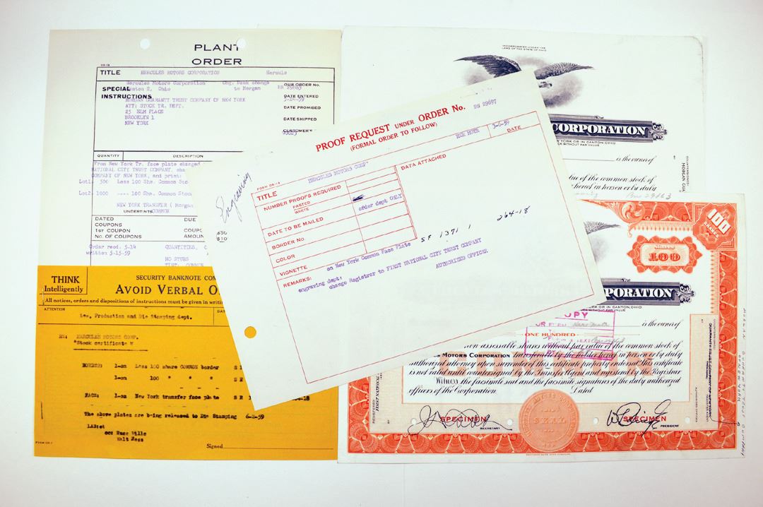 OH. 100 Shrs Stock Certificate Specimen. Along with Security BNC internal supporting documents outlining changes for a new order of stocks, and a new black plate proof. Group of 5 pieces, some attached.