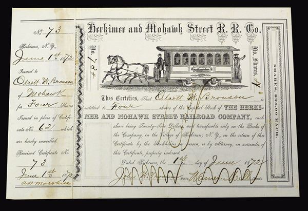 New York. 4 Shares Issued Stock Certificate. I/U. Black ink with simple border. Vignette of horse drawn carriage at top center. Crossed out canceled. Very Fine.