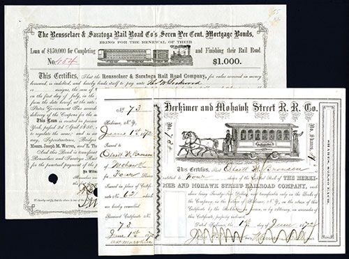 Lot of 2 certificates, Includes New York, 1872, Herkimer and Mohawk, I/C, 4 Shares, #73, Black print with vignette of horse drawn street car top center, VF condition and New York, 1862, Rensselaer & Saratoga, $1000, 7% I/C, Bond, #454, Black print with simple black border and vignette top center of early locomotive, POC's, VF condition.Listed railroad and stock in Cox.