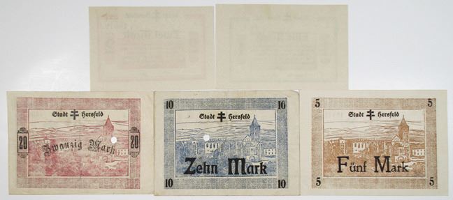 Germany. 1918, Stadt Hersfeld, Lot includes a quintet of 1, 2, 5, 10, and 20 Mark Notgeld, some voided with POC others with "UngÙltig" handstamp. Fine to XF. (5)