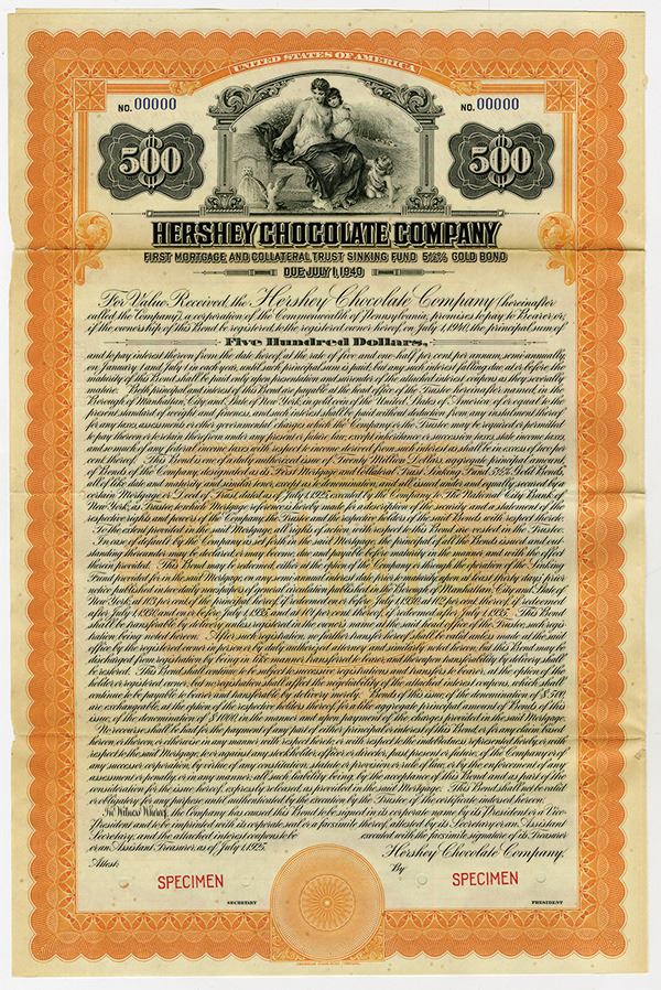 Hershey, Pennsylvania, 1925, $500, Specimen 5 1/2% Gold Bond. Orange border. Seated allegorical woman with two children. Red specimen overprints, POC's and "00000" serial numbers. Fine condition with reinforced horizontal folds from archival storage. Rare early famous chocolate makers bond. ABNC.