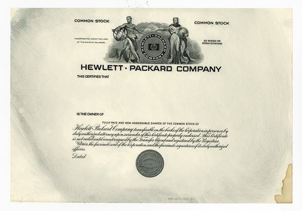 Delaware. Odd Shares Common Stock Proof Certificate. Black print with no border. Vignette at top of two allegorical figures, male and female, flanking the company logo. XF condition with minor stain at bottom right corner.