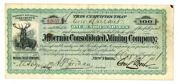 Lake County, Colorado (Inc. in New York). 100 Shares Capital Stock Issued Certificate, Black print on green border and under tint on small check sized certificate, Image of buck at left side, Staple holes at top left corner and ink stain center left, Fine-VF condition, ABNC.