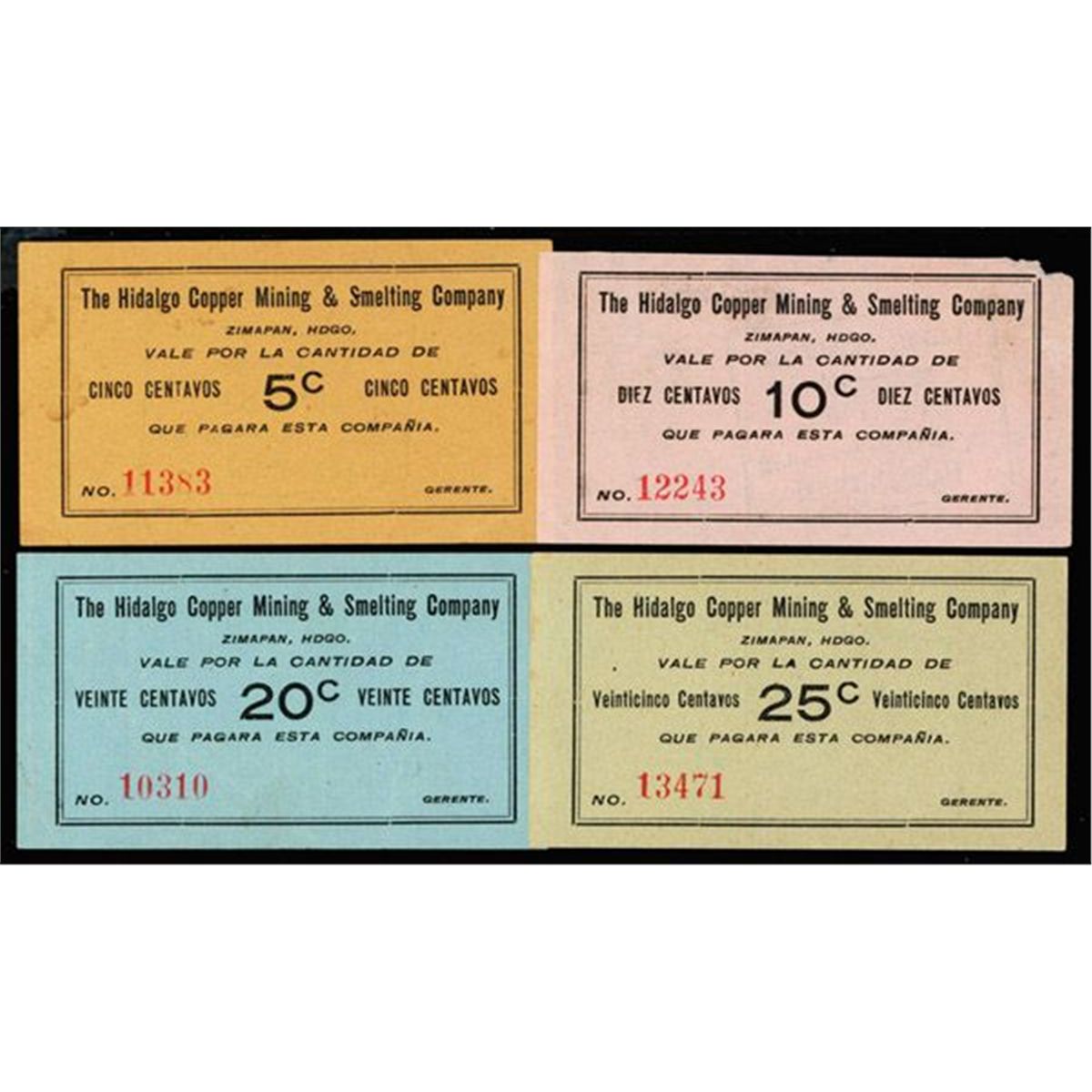 Zimapan, Hidalgo, Mexico. June 15, 1915. Lot of 4 remainder notes without signatures, all are P-Unlisted (PI-HID-106 to 109). All are printed in black on different color paper, 5 cts, light orange paper; 10 cts, pink paper; 20 cts, light blue paper and 25 cts, light yellow paper, all with red serial numbers and with blue rectangular overprints on back with name of company, date and location. AU to CU condition. Scarce and attractive Mexican Revolutionary period scrip notes.