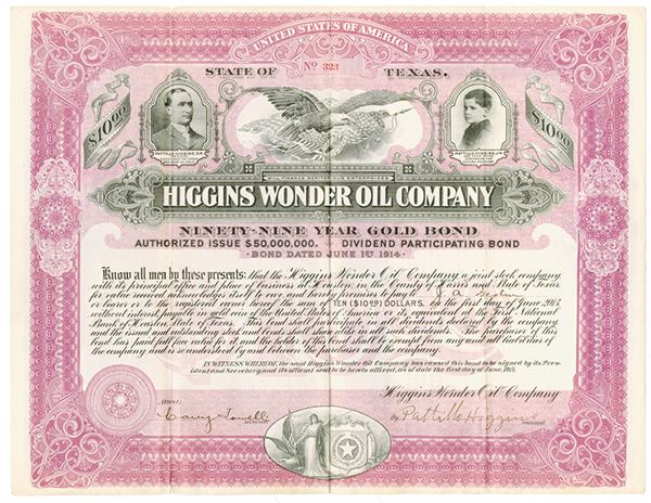 Houston, Texas, 1914, $10, Issued and uncancelled, black on purple underprint and borders, patriotic eagle flanked by photo vignettes of Patillo Higgins, Sr. President, "Discoverer the Great Beaumont Oil Field" and Higgins Junior on right "Age Four Years, Preparing For Future President", Certificate # 323, Allegorical liberty with Texas arms on bottom. VF condition with slight wear at folds. Rare, Attractive and a centerpiece for any advanced collection. R.M. Smythe sold a similar example in 2001 for $5775. Self-taught geologist Patillo Higgins became known as the ÒProphet of SpindletopÓ a decade after founding his Gladys City Oil, Gas & Manufacturing Company in 1892. He was instrumental in discovering the world-famous Spindletop oilfield at Beaumont, Texas. Although Higgins had left the company, he wisely retained some leases at Spindletop field. He subsequently formed the Higgins Oil and Fuel Company and then the Higgins Wonder Oil Company, which drilled actively in Chambers, Wilson, Bexar, and Gonzales counties, Texas, in 1916-1918. Rare, dramatic and historic bond.