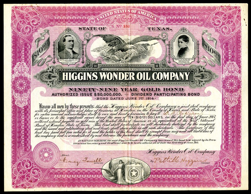 Houston, Texas, 1914, $10, Issued and uncancelled, black on purple underprint and borders, patriotic eagle flanked by photo vignettes of Patillo Higgins, Sr. President, "Discoverer the Great Beaumont Oil Field" and Higgins Junior on right "Age Four Years, Preparing For Future President", Certificate # 152, Allegorical liberty with Texas arms on bottom. Small paper clip rust area on top left border, otherwise in VF to XF condition. Rare, Attractive and centerpiece for any advanced collection. (ex-R.M. Smythe & Co., September 14, 2001, Public Auction 213, Lot 1148, Sold for $5775).