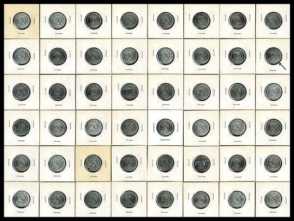 High Grade Weimar Republic Grouping. 1-48) KM#27. 1921 50 Pfennigs A, F and E. Mostly Uncirculated. 49) KM#28. 1922A. 3 Mark. Unc. 50-54) KM#35. 1923 A, A, A, G. Mostly Uncirculated. 55) KM#18. 1911E. 25 Pfennigs. Unc. Catalog Value approximately $450. [55 pcs.], weight approximately 1 lb.