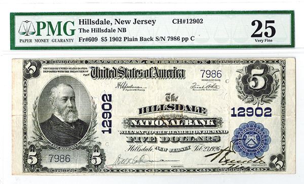 Hillsdale, New Jersey. $5, Charter #12902, 1902 PB, Speelman | White Sigs., Fr#609, S/N 7986, PMG graded Very Fine 25.