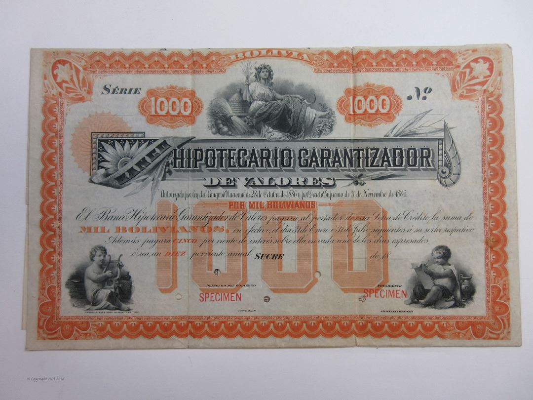 Bolivia, 1880s. 1000 Bolivianos Specimen Bond in Spanish, Black text with orange border and underprint, Allegorical woman at top holding scythe and wheat. Red specimen overprints, POCs. Fine-VF condition, ABNC.