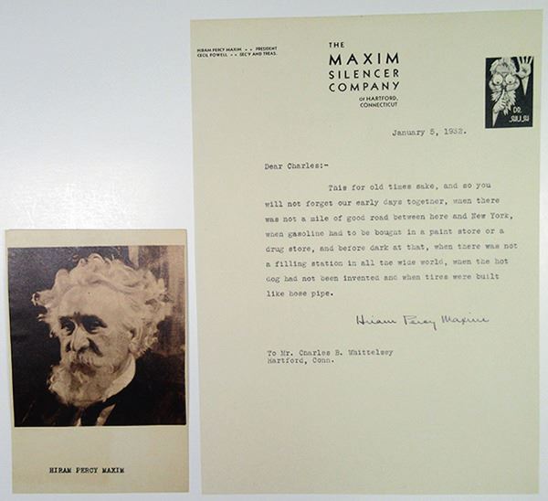 Connecticut, 1932. Letter written by Hiram Percy Maxim on Maxim Silencer Company letterhead to friend Charles B. Whittelsey regarding "old times," with Maxim's signature, also included is a 4x6 inch portrait of Maxim in later years. The Maxim Silencer Company was a successful firearms company that manufactured silencers to muffle the sound of gunshots. Rare autograph of Maxim.