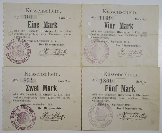 Germany and France. (District of Alsace). 1914. Lot includes a quartet of 1, 2, 4, and 5 Mark Notgeld, Die§n. K-152.1, all with validation handstamps and signatures, the 4 Mark with 2 POCs. Fine to VF. (4)