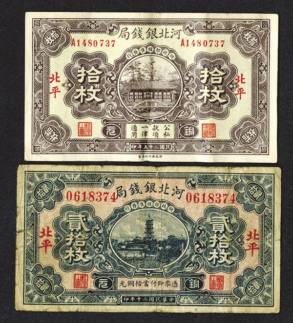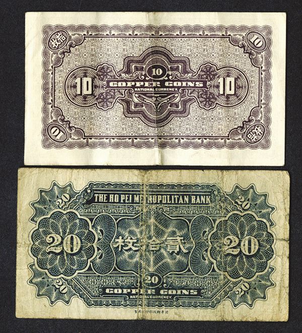 China. 10, 20 Copper Coins. P-S1710D, S1710E. S/M H63-20, H63-21. Tea House and Tall Pagoda at center respectively. Fine and Very Good with paper separation at ends of folds. 2 pieces. (The Silicon Valley Collection)