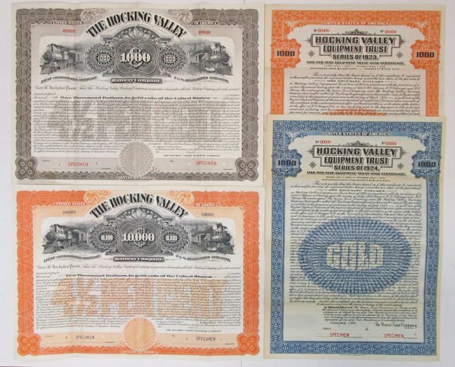 Ohio, 1899-1924. Hocking Valley Railway, Lot of 4 Specimen Bonds, Includes: 1899, Hocking Valley Railway Co. $1000 Registered 4 1/2% Gold Bond with brown border; 1899, $10,000 Registered 4 1/2% Gold Bond with orange border; 1923, Hocking Valley Equipment Trust $1000 5% Gold Coupon Bond with orange border; and, 1924, $1000 5% Gold Coupon Bond with blue border. All have Specimen overprints, POCs, and are in VF-XF condition, ABNC. (4). Sold "AS IS" no returns accepted.