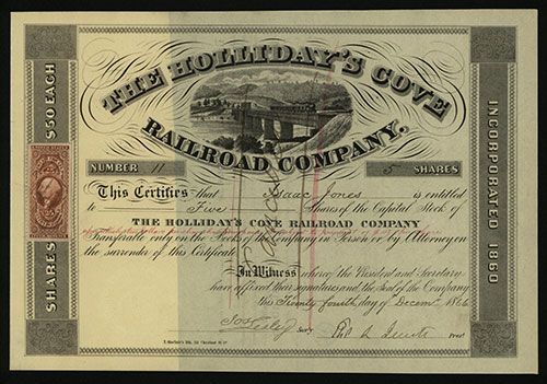 1866, I/C, 5 Shares, #11, Black print with ornate black border on light yellow paper, Moving locomotive over bridge top center, Ink cancelled through center vertically, VF condition, T. Sinclair's Lith. Railroad and stock listed in Cox.