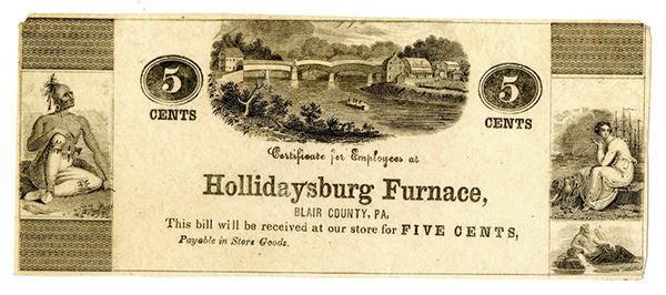 Hollidaysburg, Blair County, PA., "Certificates for Employees at….", 5cts, H159-34, Vignettes include bridges, Native Americans and allegorical woman, Choice XF to AU with the upper left corner tip missing. Scarce note rarely seen at auction.