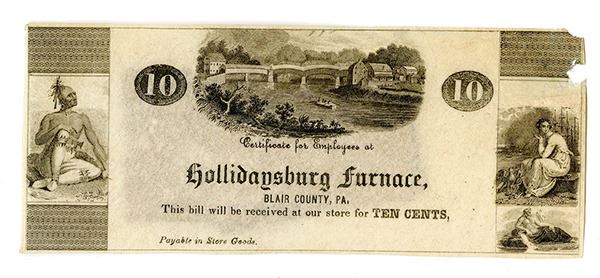 Hollidaysburg, Blair County, PA., "Certificates for Employees at….", ; 10cts. H159-35, Vignettes include bridges, Native Americans and allegorical woman, Choice XF to AU with a small piece on the upper right border, possibly due to an internal paper flaw. Scarce note rarely seen at auction.