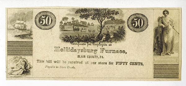 Hollidaysburg, Blair County, PA., "Certificates for Employees at….", 50cts, H-159-37, Vignettes include sailing ships, cherub, allegorical woman and small train in middle, AU to Choice AU with an internal paper fold in bottom middle keeping note from Uncirculated. Another scarce note rarely seen at auction.