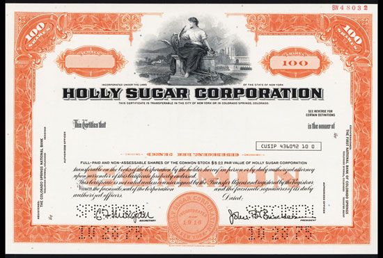 New York, 1975, 100 Shares, Pin-Punch Specimen Stock, Black on orange border and underprint, Sitting allegorical woman top center holding winged wheel with farming scene to the left and industrial scene to the right, VF-XF condition, SCBNC.