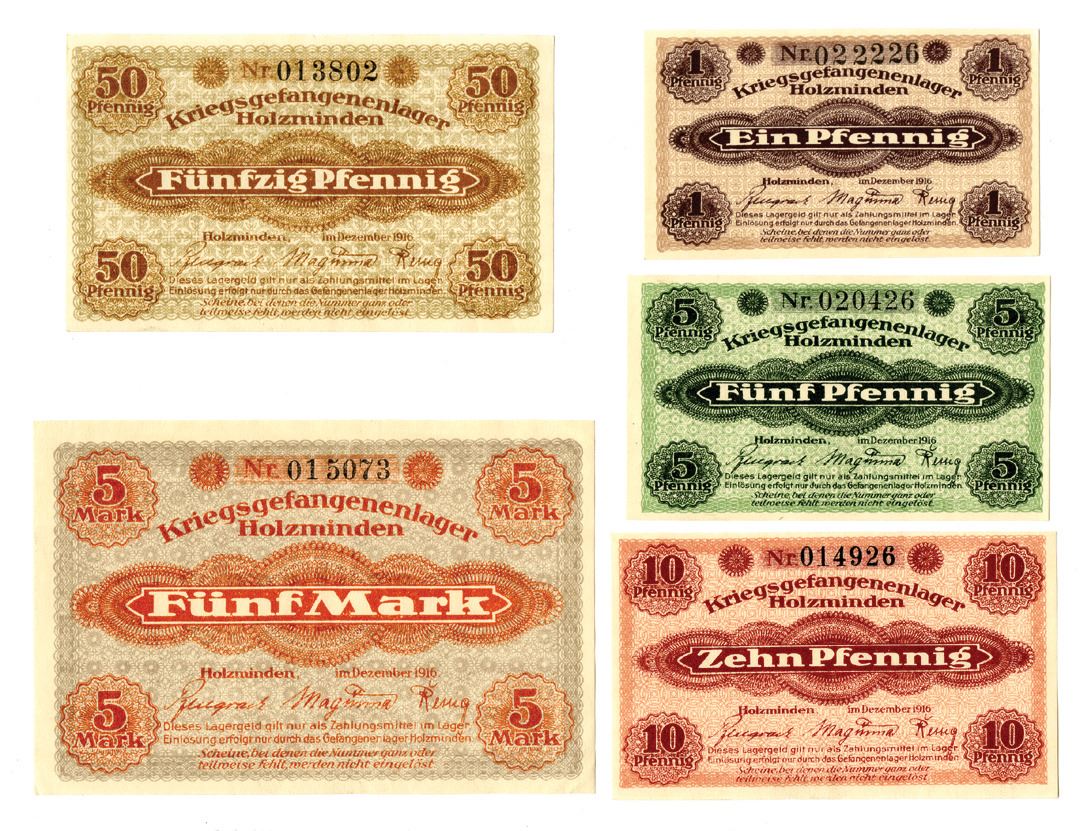 Germany, 1916.Lot of 5 Issued POW Notgeld Banknotes for use in the Holzminden Prisoner of War Camp, P-Unlisted. Includes: 1 Pfennig; 5 Pfennig; 10 Pfennig; 50 Pfennig; and 5 Mark. All are in Uncirculated to Gem Unc. condition. (5)