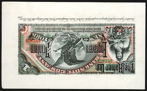 NY. Homer Lee Bank Note Co. Color tipped-in advertising page from the Railway Guide. One side intaglio, other is not. Slightest bend at left end not affecting the note design. Slightly dirty. Very Fine or better.