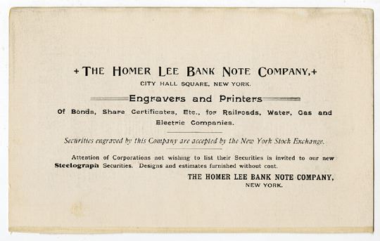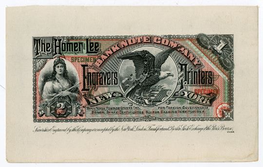 New York, NY. (ca.1880-90s) Homer Lee Bank Note Co. Multicolor intaglio advertising note printed on thin card, eagle in middle with Liberty at left, back with information of the products the company prints. Uncirculated condition. HLBNC.