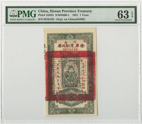 China. 1921, 1 Yuan, P-S3855, S/M#H60-1, overprinted on P-S2985, Green with large red seal, back red and blue, S/N 0870120, PMG graded Choice Uncirculated 63 EPQ.
