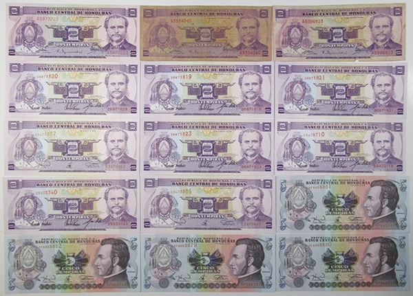 Honduras, ca. 1970-1990s. Lot of 15 Issued notes, includes 1961, 2 Lempiras, P-61, CU (1) and VF (2); 1993 and 1994, 2 Lempiras, P-72a, 8 examples, CU; 1994, 5 Lempira P-63d CU (4). TDLR (15).