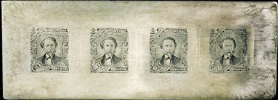 1893. Scott #82-85. 30c-75 Centavos. Compound printing plate. 142x52x4mm steel die, composite showing full designs of the 30c, 40c, 50c and 75c issued stamps, some small cross-hatching on the back of the plate of each design. XF condition. Unique in archive.