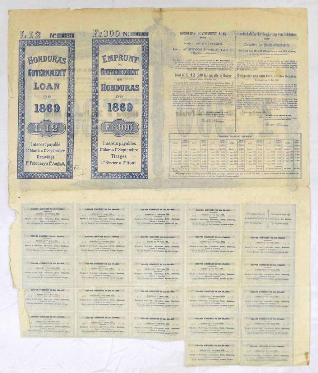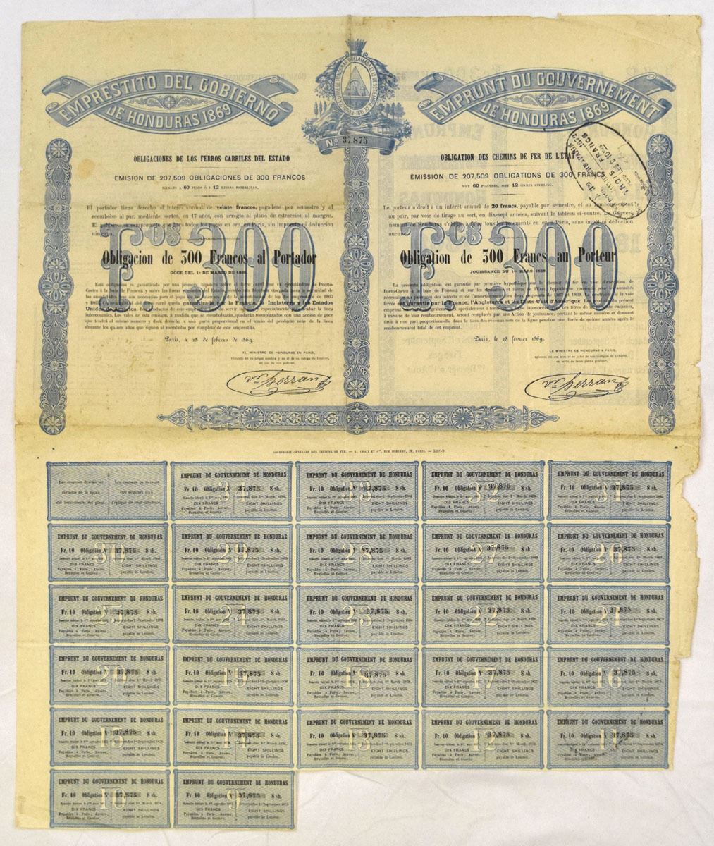 Honduras, 1869. Emprunt du Gouvernment de Honduras, 300 Francs I/U Bond, Black print on blue border and underprint, Printed in Spanish and French, Fine-VF condition.
