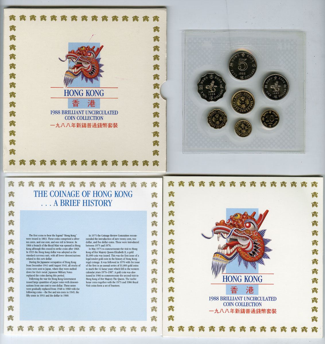 Hong Kong, 1988. Brilliant Uncirculated Coin Collection in Commemorative Holder, Lot includes: 5 Cents, 10 Cents, 20 Cents, 50 Cents, 1 Dollar, 2 Dollars, and 5 Dollars, Coins are in their original shrink warped packaging, Mint condition.