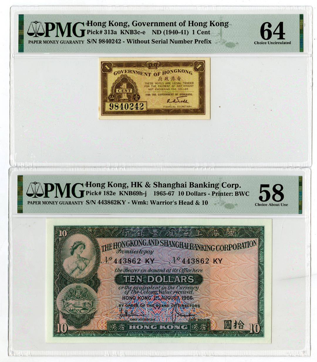 Hong Kong, ND (1940-41)-1965-67. Lot of 2 Issued banknotes: 1 Cent, P-313a KNB3c-e, Brown on multicolor underprint, S/N 9840242, PMG graded Choice Uncirculated 64; and, 10 Dollars, P-182e KNB69h-j, Green on multicolor underprint, S/N 443862KY, PMG graded Choice Uncirculated 58. (2)